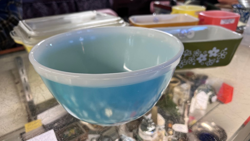 CoxRetros is on vacation right now, though it’s a bit of a work vacation because we are shopping almost every other day and have found some great pieces, including this Pyrex mixing bowl, #403, from their Multi-Tone Blue (a.k.a. Americana Blue) from 1967 to 1969. I’ve seen it in the Pyrex Passion book, but never in real life! We found this bowl in EXCELLENT condition at the Ole Cracker House Antique Mall in Ocala.