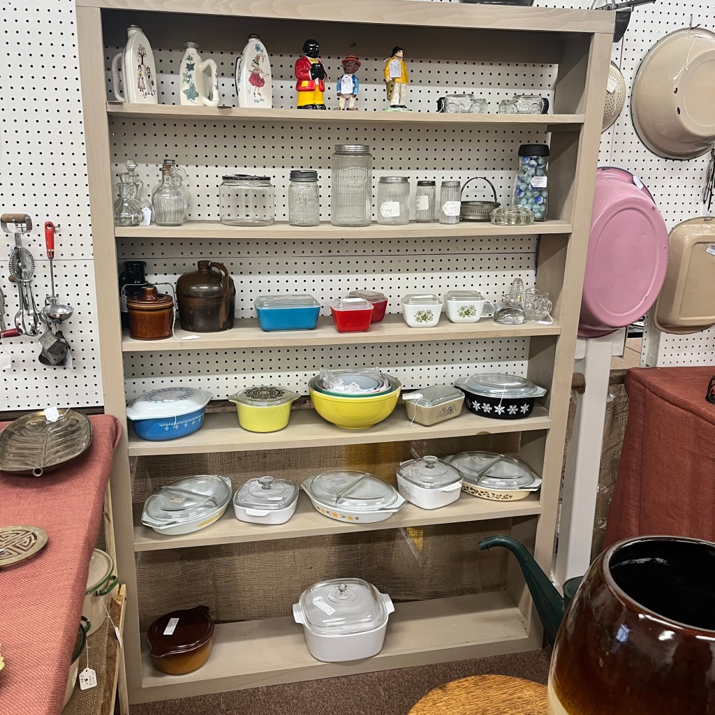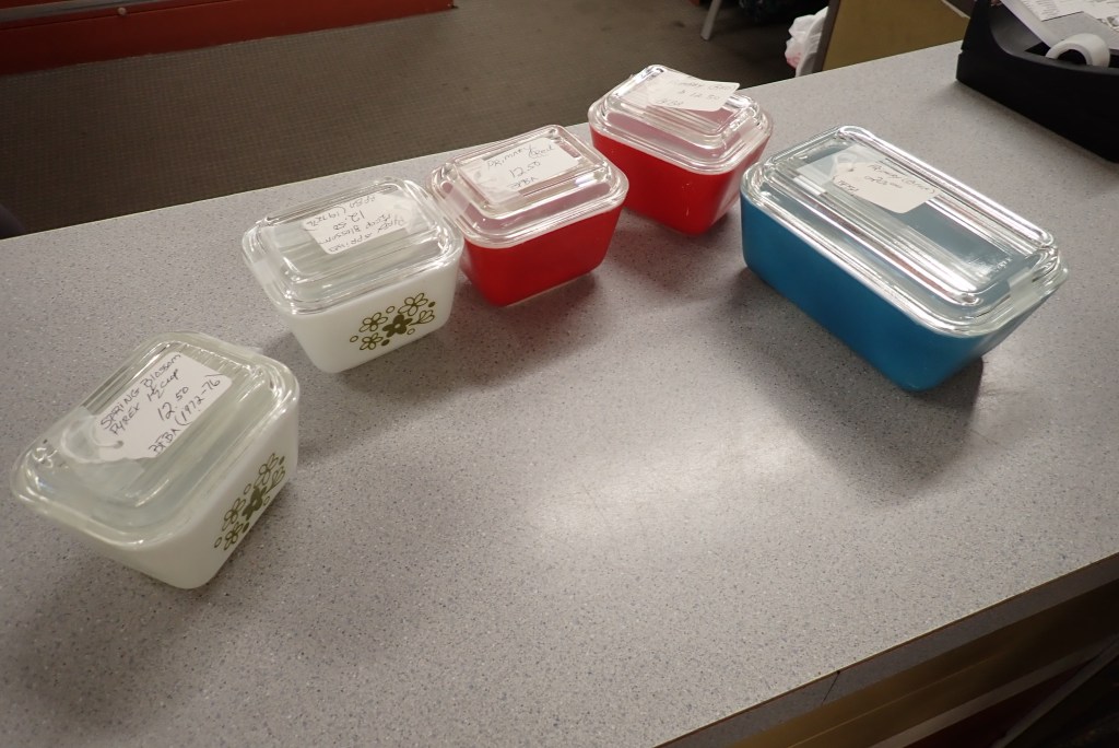 It was a promising start finding these shelves of Pyrex and Corning Ware. At this point, at our very first stop, we didn’t know how the shopping was going to go. The Corning Ware I found was good, but standard pieces that I can find in Maine, and also for less. But the Pyrex!